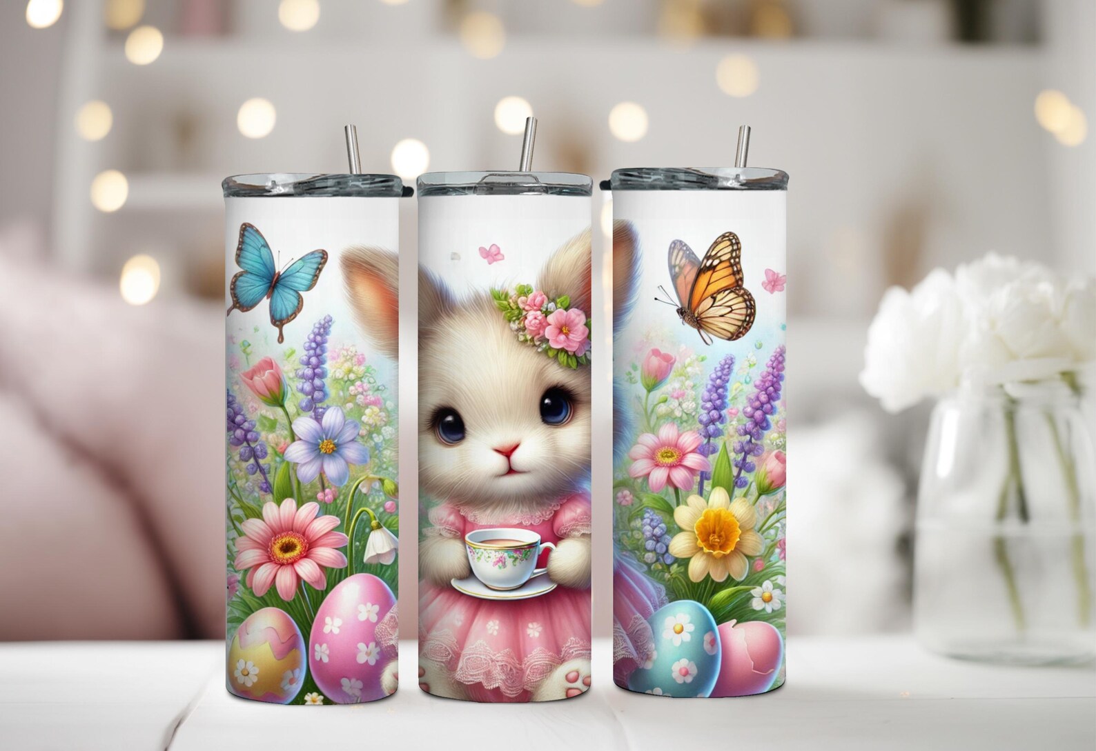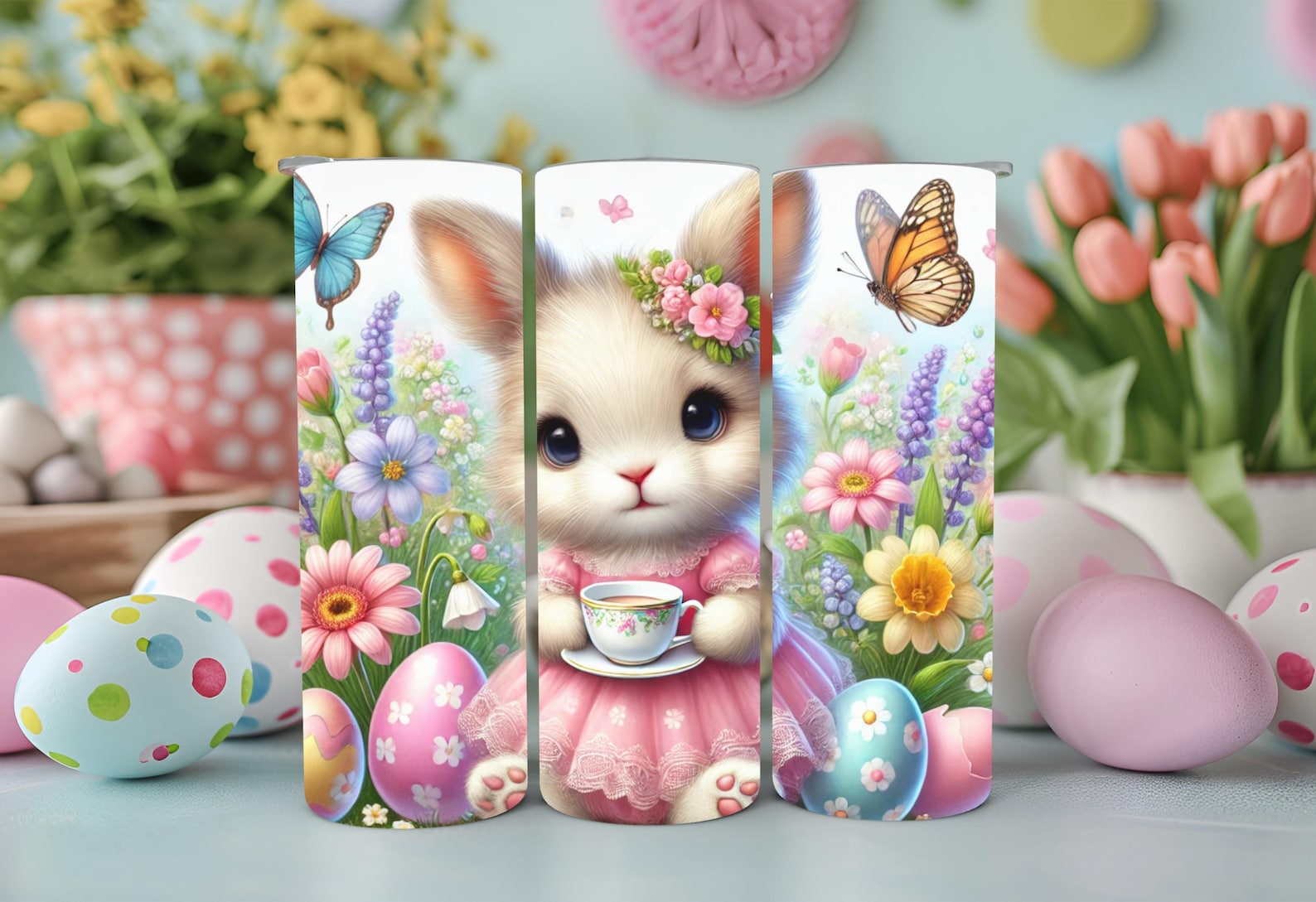 Easter bunny tumbler, spring floral tumbler, insulated drinkware, stainless steel Easter cup, travel tumbler with lid, Easter gift idea, cute bunny drinkware, pastel aesthetic tumbler, seasonal spring cup, adorable animal