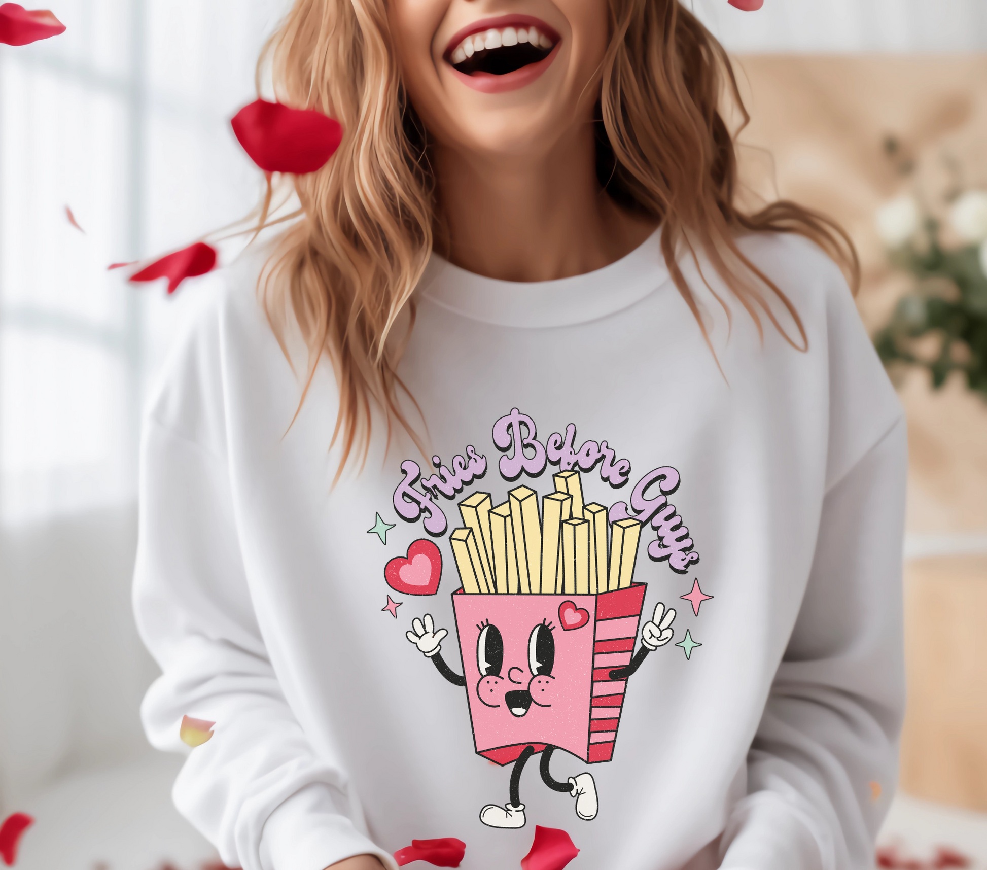 Fries Before Guys sweatshirt, playful graphic sweatshirt, friendship fashion top, casual chic clothing, Valentine's Day alternative, humorous apparel, gift for best friends, cozy winter wear, quirky style sweatshirt, fun and comfy clothing.